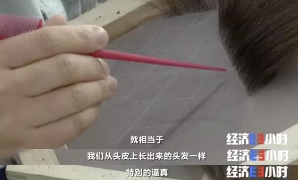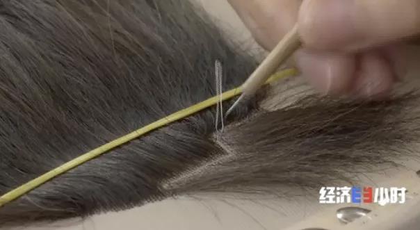 为了让佩戴效果更逼真,而且更舒服、更透气,整个假发套的头顶和发际线都需要人工一根一根地把头发钩织到发网上,这是整个假发套加工最核心的部分,难度也是最高的。