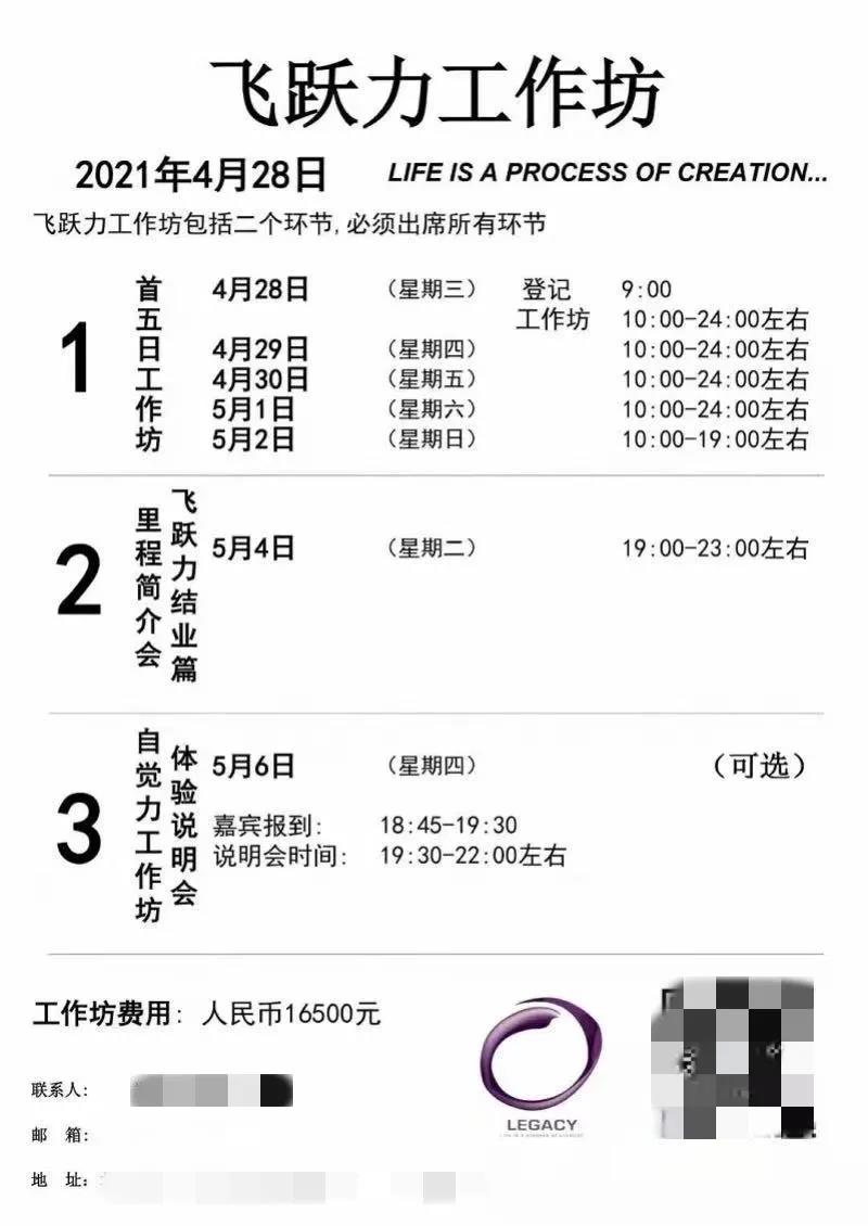 据其公众号介绍,不同的工作坊有着不同的学习时间和收费。其中,自觉力工作坊收费9800元,分为首五日工作坊、创新生活面谈和自觉力体验说明会3个阶段,第一阶段课时为3个晚上加2个整天。魏萌所参加的飞跃力工作坊是一个“强而有力、很具挑战性”的体验式工作坊,收费16500元。