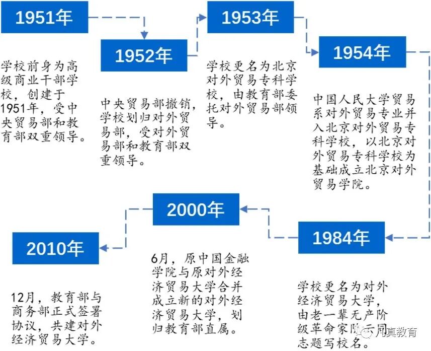 1954年,高等教育部决定,以北京对外贸易专科学校为基础,合并中国人民大学贸易系的对外贸易专业,成立北京对外贸易学院(简称“贸院”),成为当时全国唯一的一所培养外贸干部的高等学校。