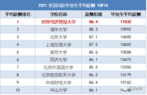 中国薪酬指数研究机构发布的《2021全国高校毕业生薪酬指数排行榜》显示,按照毕业生平均月薪计算,对外经济贸易大学在所有大学中排名第一。
