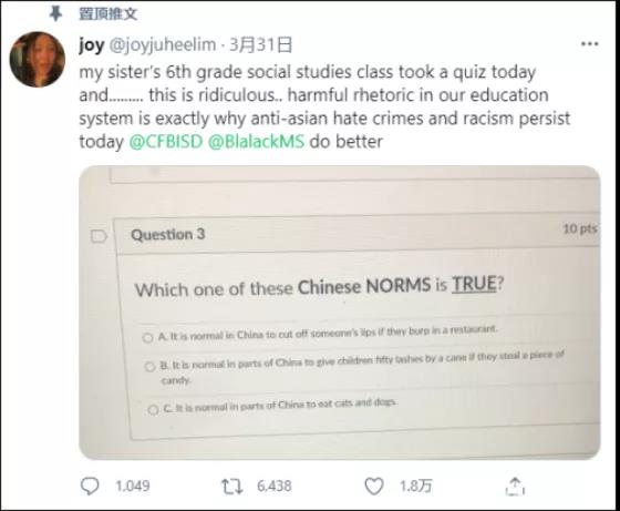 一些仇恨行为甚至已不局限于个人。3月31日,得克萨斯州一名女大学生Joy Lim在其社交媒体账号上爆料称,自己上六年级的妹妹的试卷上出现了一道明显侮辱华人、涉嫌种族歧视选择题。