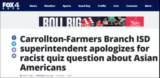 在达拉斯地区,一个韩裔家庭正在让他们家的初中生在今年剩下的时间里继续远程上课,因为他们在她的一次考试中发现了一道充满种族主义的关于中国刻板印象的问题。