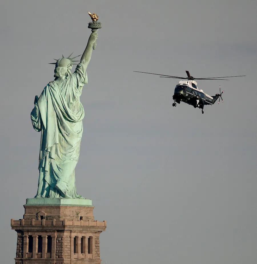 海军陆战队一号飞过自由女神像(照片:美联社)从正面看,自由女神右手高举火炬,左手捧着刻有独立宣言发表日期的石板册,头上戴着有7个利刺的冠冕,代表着7个大洲以及7片大海,脚下踩着断裂的铁链,象征着奴隶解放及暴政被推翻。目前从法国运来美国的第二座自由女神塑像按1比16的比例全盘复制母像,这座被称为“小妹”(Little Sister)的青铜像建成于2009年。