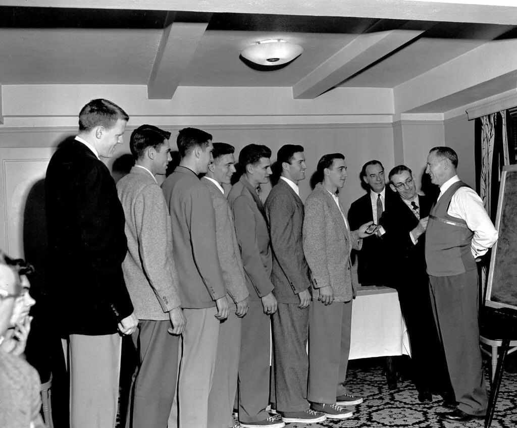 1952年4月1日,堪萨斯大学篮球队教练Forrest C."Phog"Allen(右)在纽约为制作奥运会队服量体,七名队员在旁边排队等候。(美联社供图/Bob Schutz)