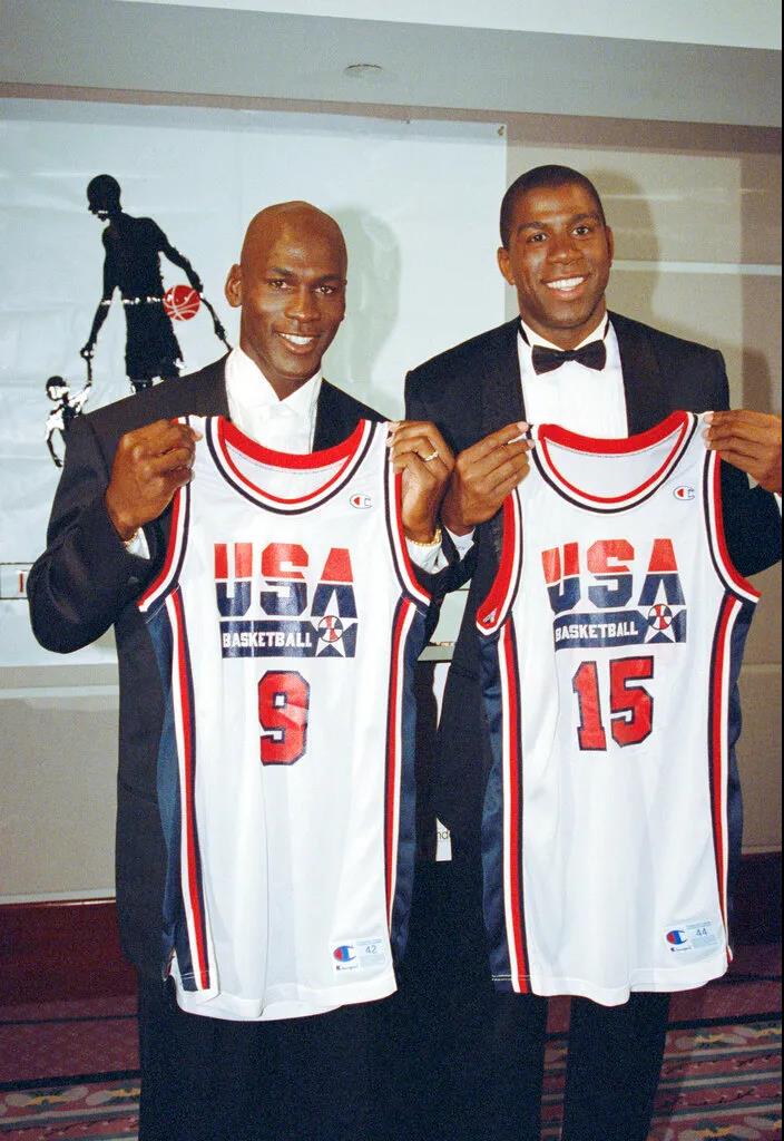 1991年9月21日,芝加哥公牛队的迈克尔·乔丹(左)和洛杉矶湖人队的埃尔文·“魔术师”·约翰逊在伊利诺伊州芝加哥展示1992年美国奥运会篮球队的新队服。(美联社供图)