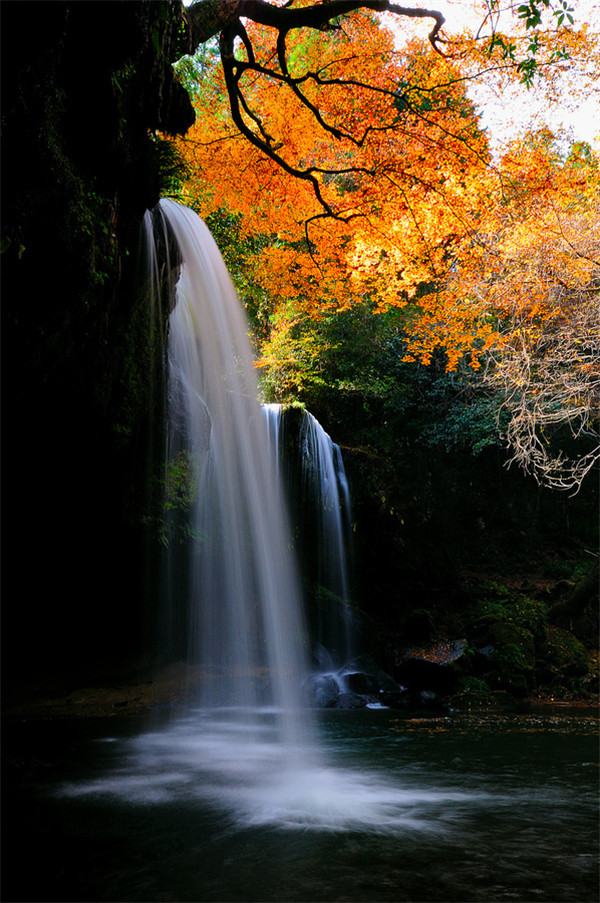 再往前走,我看见一道很高的阶梯,看起来有好几百级台阶。路标指示台阶的最上边就是瀑布。我们顺着台阶爬啊爬啊,累极了。我正想放弃的时候,突然,看见一条很美丽的瀑布,从天空挂下来。我从来没有看到过那么美丽的景色,这让我想起了一句诗:“疑是银河落九天。”秋色真美!