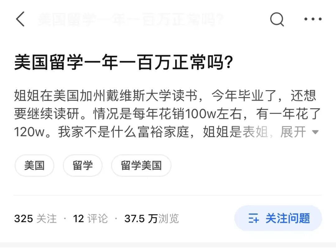 美国留学一年一百万正常吗?最近,学霸君上网冲浪,看到了这样一则超过37万浏览量的热门议题。题主分享道——