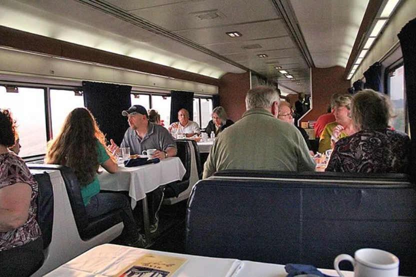 到了晚餐时间,因为座位有限,在Amtrak的餐车内用餐,一般都需要和陌生人拼桌。