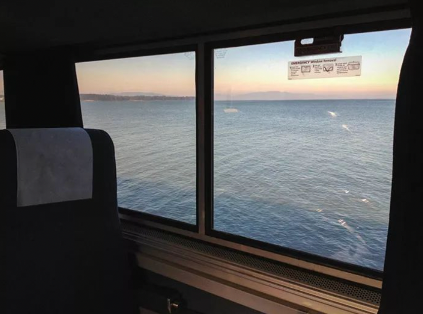 旅程从旧金山湾开始,安静的水面令人感到心旷神怡,最近的时候铁轨大概离海水只有1英尺的距离。