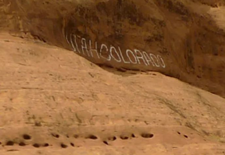 进入科罗拉多州,铁轨旁的石壁上刻着州界。