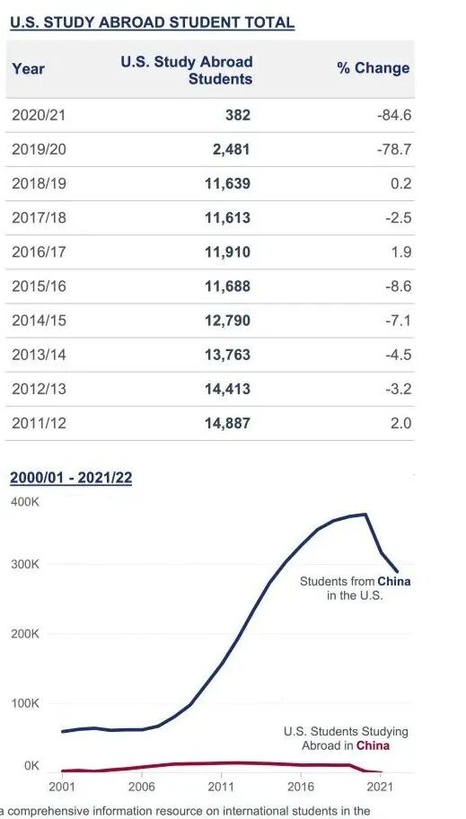 数据显示,2020-2022学年,美国赴中国读书的学生已连续两年下降约80%,直接看总数会更直观,从2018-2019学年的11639人,下降到了382人,不及三年前的零头多。