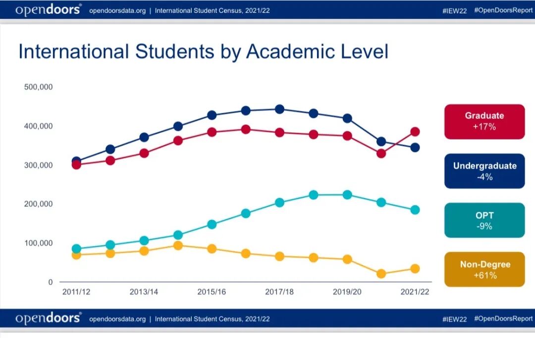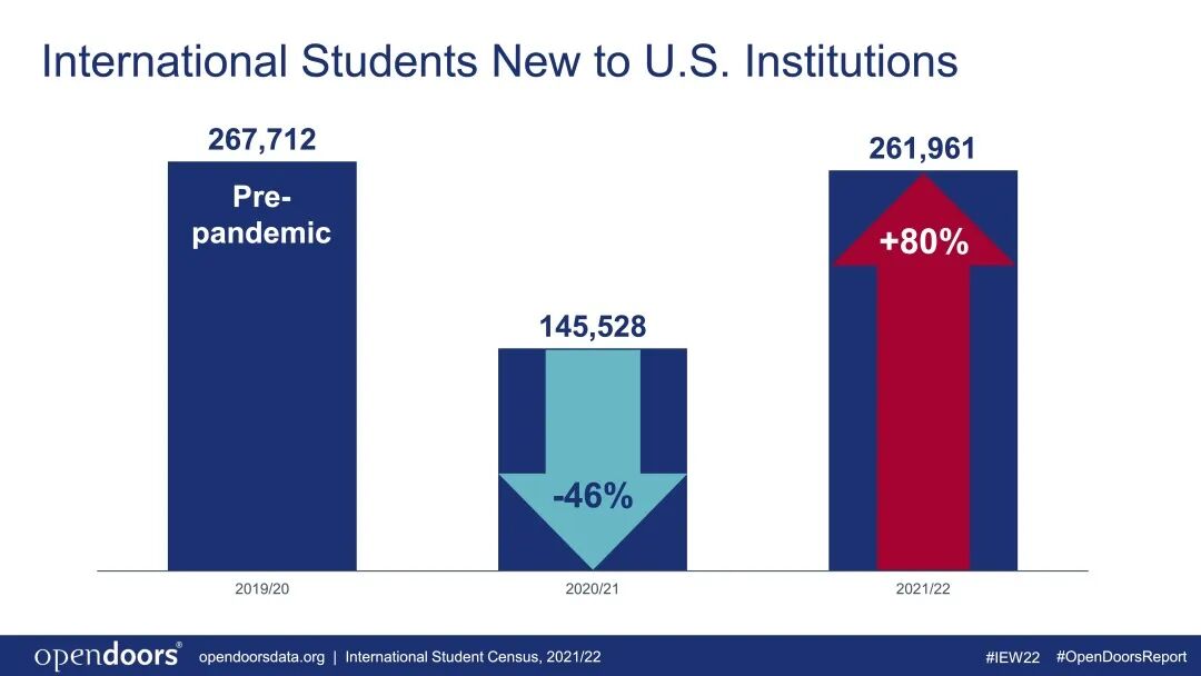 还有一点值得注意的是是,2021-2022学年在美国际新生有261,961人,同比增长了80%,基本恢复到了疫情前的水平。