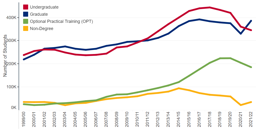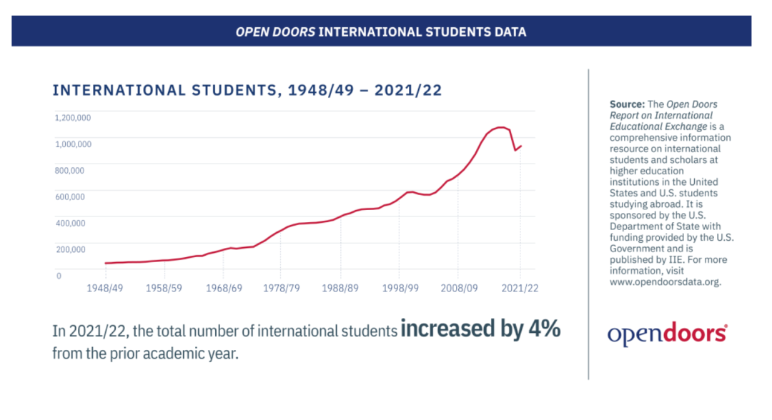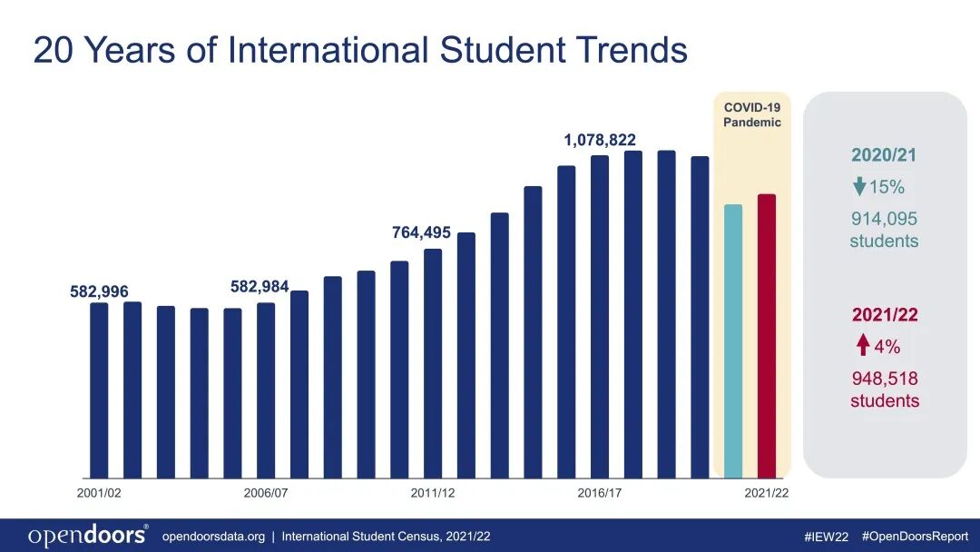 从全球来看,2021-2022学年,来自200多个国家的948,519名国际学生在美国大学学习,同比增长3.8%,跟去年的最低谷比起来,有所回温。