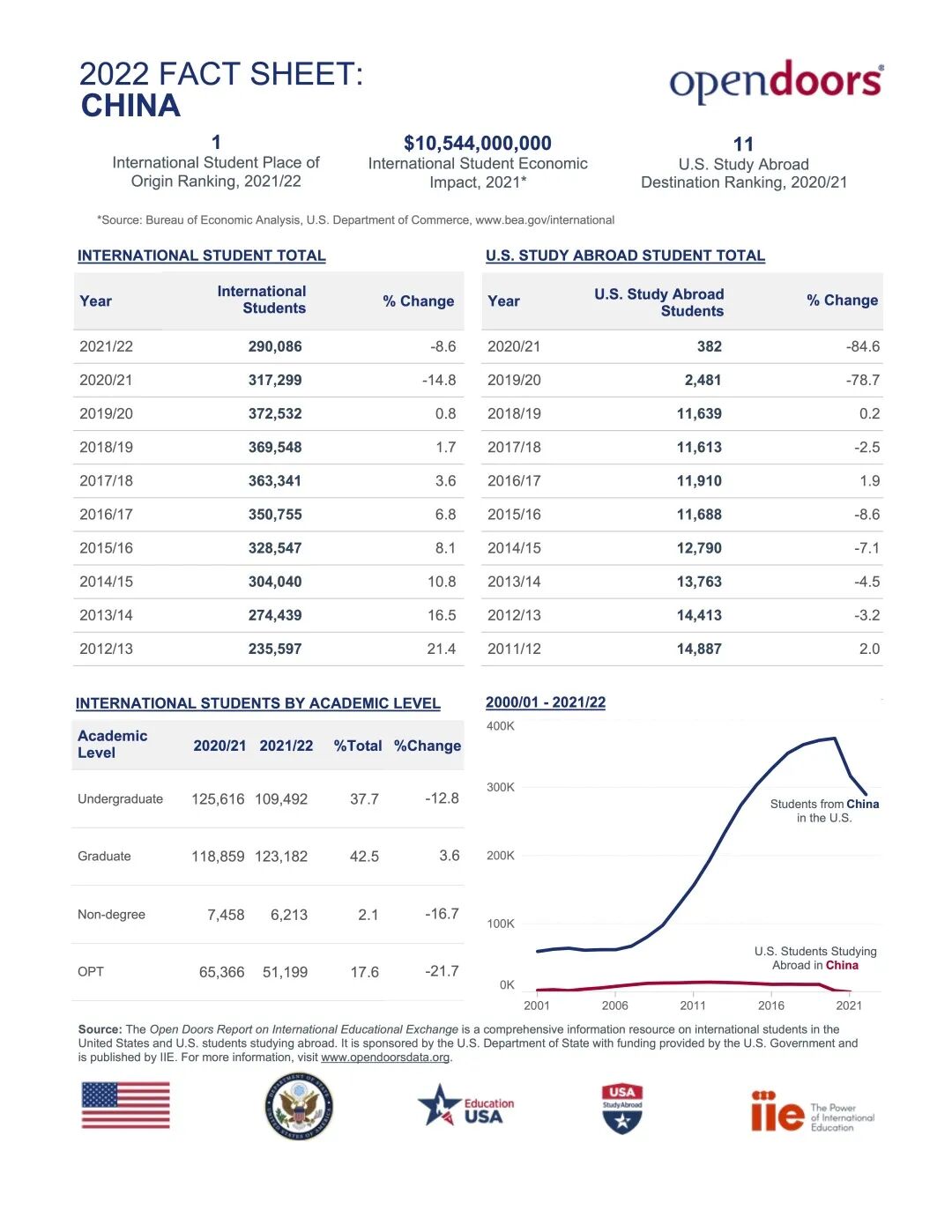 Open Doors官方还特别整合了一整页的数据,分析10年来中美之间的留学交流。