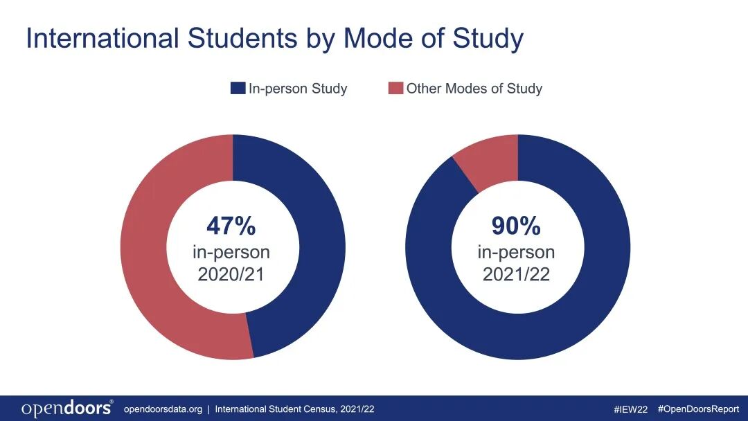 看网课,2020-2021学年只有不到一半的国际学生来到了美国校园上课,而今年已经有90%已注册国际学生回到了校园。