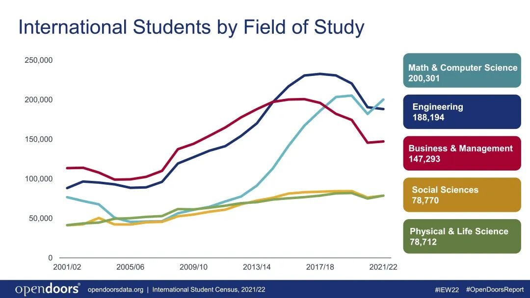比如今年最热的数学和计算机科学,有超过200,000名国际学生学习,占比21%,其次是工程专业,有超过188,000名国际学生。