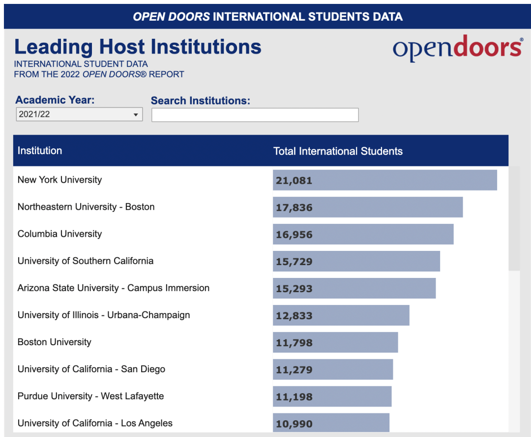 最后一部分,我们看看Open Doors公布的最受赴美留学生欢迎的大学,也就是国际学生人数最多的大学。