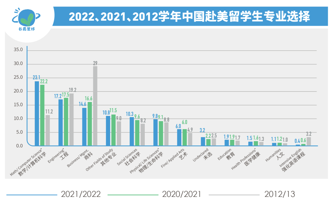 为了找到中国留学生的专业选择变化,我们独家对比了2022、2021、2012学年数据发现: