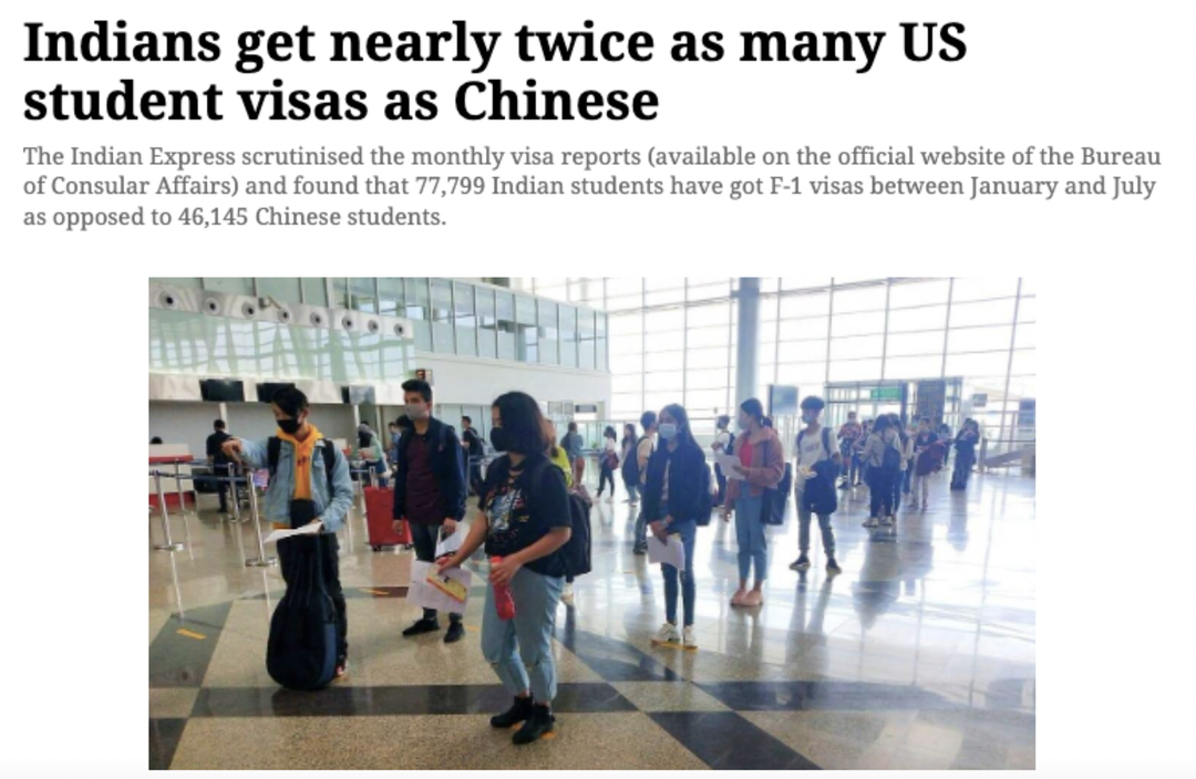 图:印度媒体曾用《印度获得美国学生签证数量是中国2倍》为标题大肆报道。
