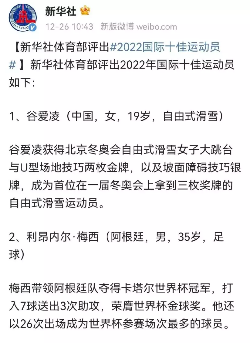 在新华社体育部评出的2022年国际十佳运动员榜单里,谷爱凌是唯一入选的中国选手,排在刚拿到大力神杯的梅西前边