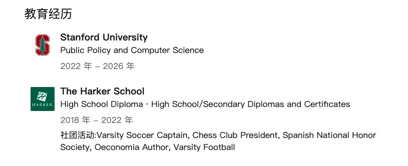 高中毕业于美国硅谷的顶尖私立高中哈克学校(The Harker School),在高中还当过校足球队队长、国际象棋俱乐部主席等等。