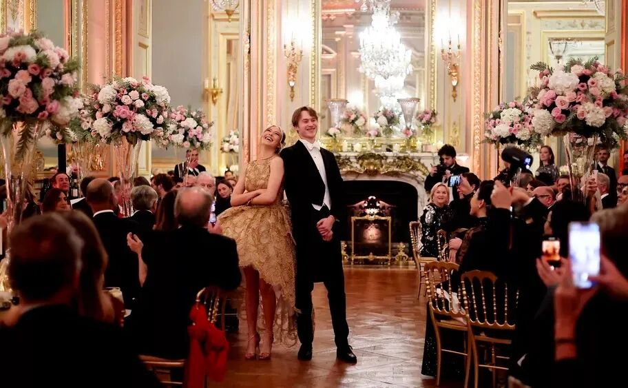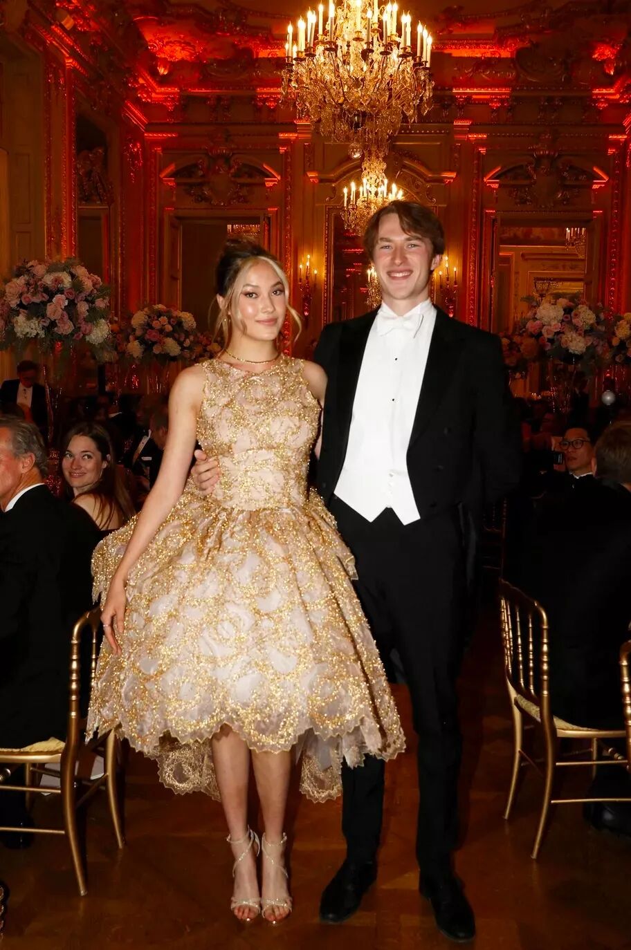 打扮得也非常隆重,用郭培高级定制香槟金色礼服,搭配活动专用珠宝商V MUSE Jewelry的作品,舞伴是来自欧洲古老家族的菲利克斯伯爵。