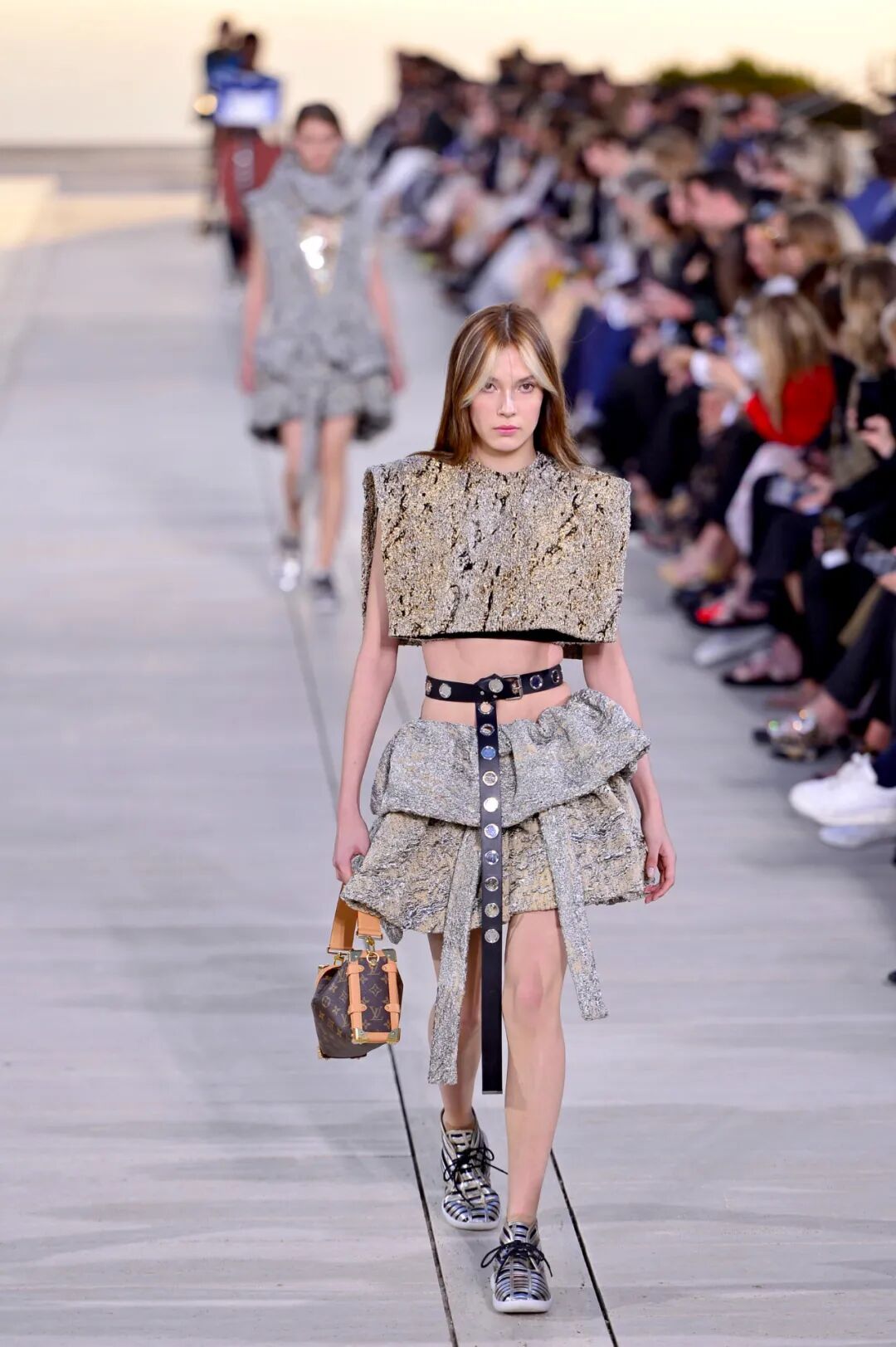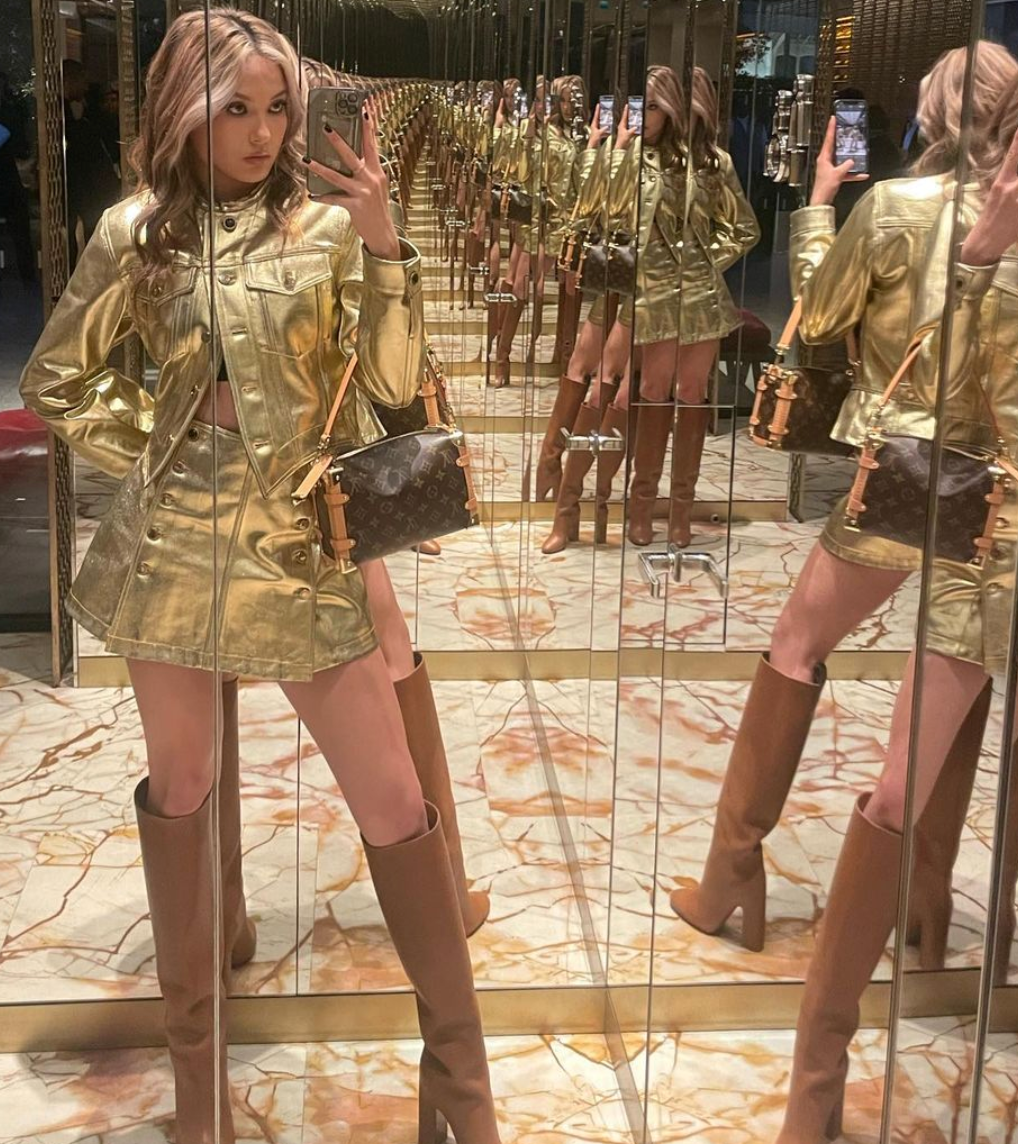 巴黎时装周上,她又穿了一套“黄金甲”战袍,搭配LV Side Trunk PM软皮小盒子。