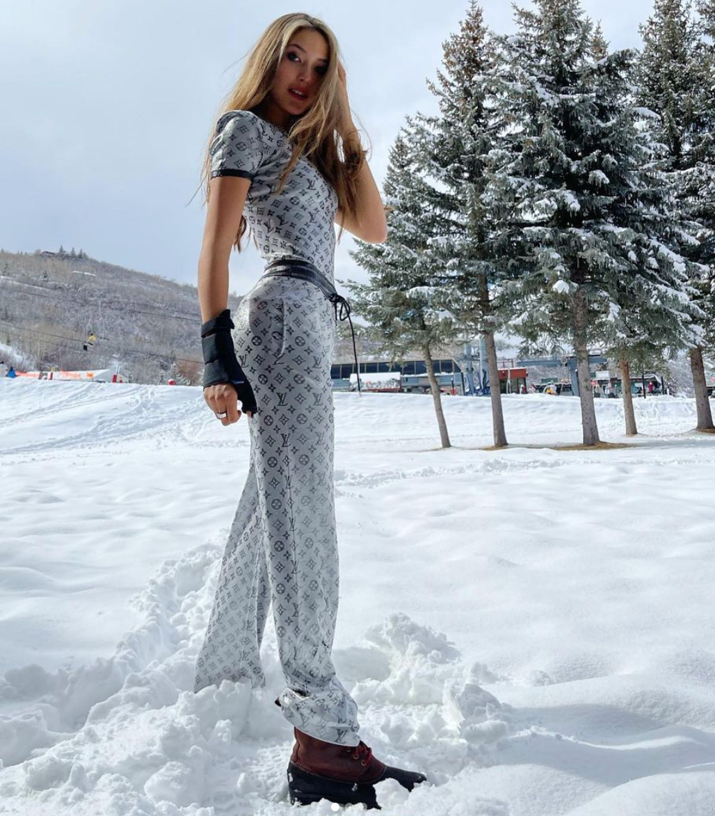 不过随着成为宇宙大牌LV、珠宝品牌Tiffany的代言人,谷爱凌就经常穿戴这两个品牌的单品带货了。比如挑战LV的大面积老花套装↓