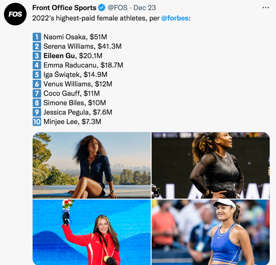 赚钱能力同样惊人,在《福布斯》公布的2022年全球收入最高的女运动员名单里,19岁的她以2010万美元(约合1.4亿人民币)的收入排名第三。