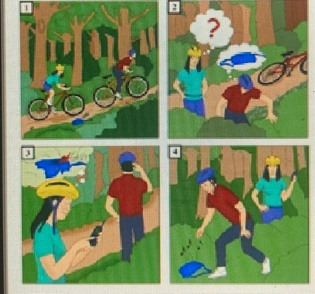 在一个万里无云的下午,大卫和他的妹妹玛丽正在附近的一个山坡上骑着自行车。大卫和玛玛丽边骑着,边观看着路旁枝叶茂盛的树木。骑着骑着,带头的大卫突然意识到自己背在背后的背包不见了,就着急忙慌地下车寻找自己的书包。