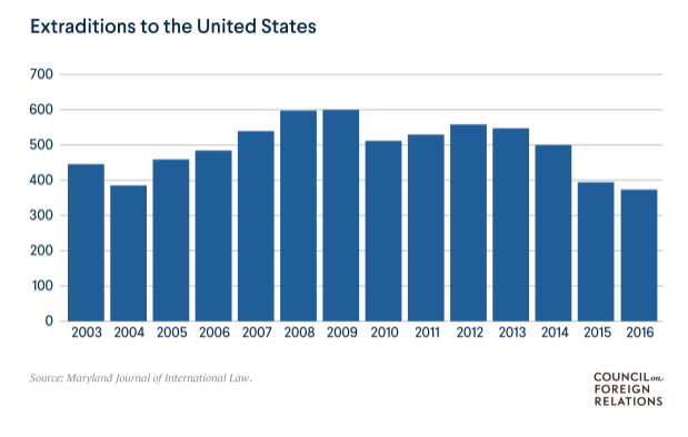美國外交關係委員會引用的數據顯示,在過去十多年,每年被引渡到美國的外國人有超過400人。而引渡並非一個單純的司法問題,影響最終決定的因素包括:執法優先項、官僚資源、經濟和政治關係。
