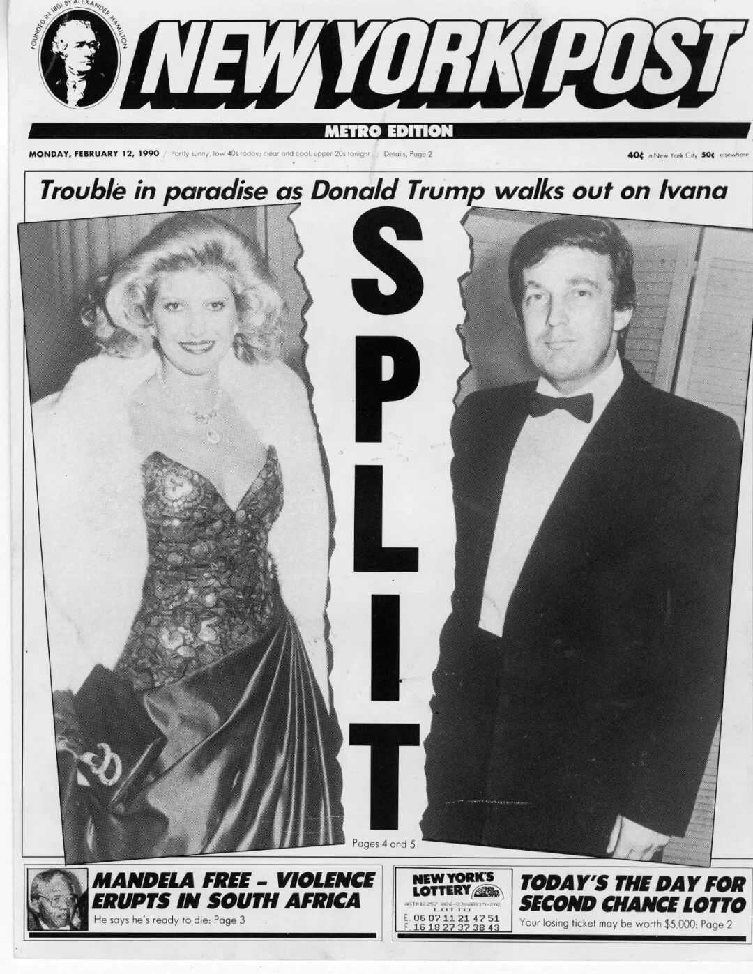 法院于1990年12月批准这对夫妇离婚,理由是特朗普的残忍和不人道待遇。接下来就是财产争夺,伊万娜坚持让特朗普给她一半的财产。