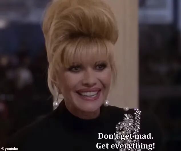 1986年,伊万娜在客串电影《前妻俱乐部(The First Wives Club)》时有一句经典台词,“女士们,你们必须坚强。记住,不要生气,要得到一切(Don't get mad,get everything)”。她自己践行着这一点,保持清醒,通过自己的智慧挣得一切。
