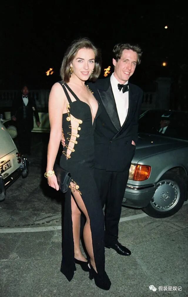 1994年。彼时还不出名的伊丽莎白·赫莉,穿着由巨大的别针缝在一起的黑色范思哲礼服与影星休格兰特手牵手出现在电影《四个婚礼和一个葬礼》的首映式。一出场就抓住了所有人的眼球,当时媒体将这件前卫的礼服称为“That dress”。而赫莉也一战成名,后来还成了雅诗兰黛的模特。