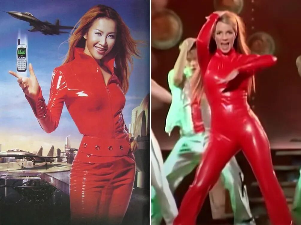 早年画风炫目的广告里,都少不了她的身影。她还撞衫过小甜甜布兰妮MV里的造型,紧身漆皮红衣look,非一般人敢尝试。