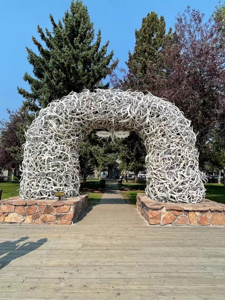 有着“美国最秀丽国家公园”美称的大提顿国家公园GrandTetonnationalPark及杰克逊镇的鹿角门Jacksoncity.导游解释说,这应该是野牛在山路上随意漫游行走,导致了这次大堵车。他感慨地说,黄石公园内的旅游因为有野生动物的出没而具有不确定性。游客们经常会注意到开车的路上有车辆停在山路上。这种情况发生,要么是因为旅客们有可能是主动停车,观赏野生动物;要么是野生动物在公园的山路上行走,而使得交通阻塞。这位导游说,当黄石公园游导游6年余,他在公园内经历最长的一次野牛堵车长达两个多小时。这是他又一次长时间堵车的经历。