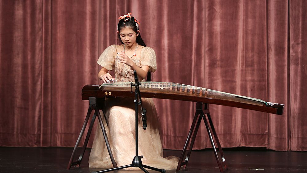 下一个古筝独奏可谓气势恢宏,来自南校区的姜焱晨同学一袭金色礼服闪亮登场,倾情弹奏了一曲《战台风》,将现场的气氛推向高潮并博得观众热烈的掌声。
