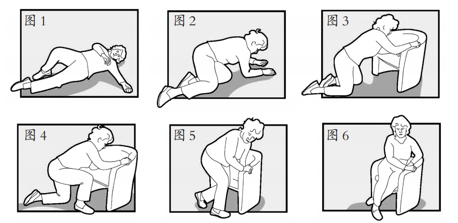 手部缓慢发力,用膝盖撑地,爬向一个坚固的椅子或家具(图2);