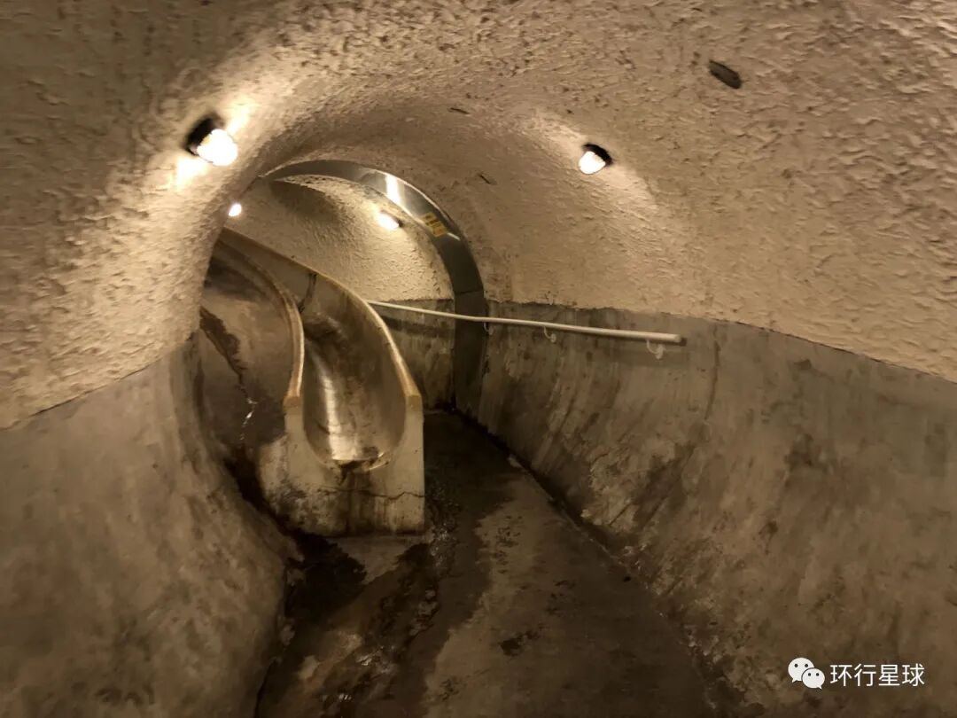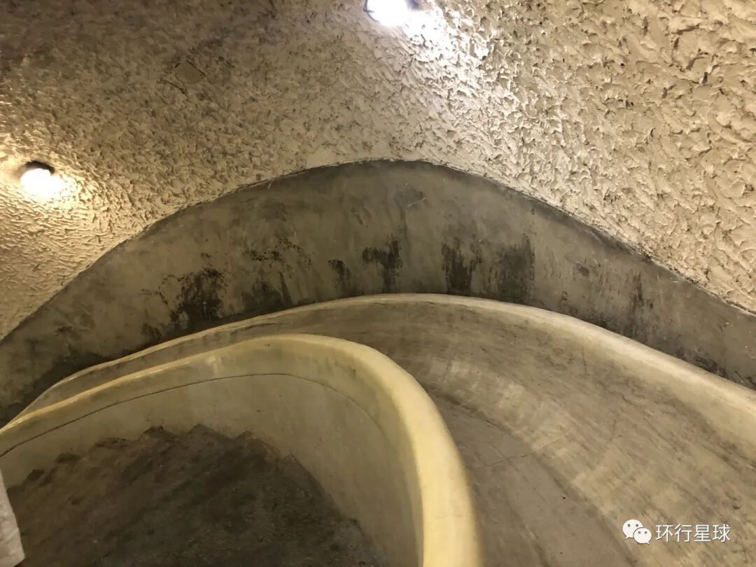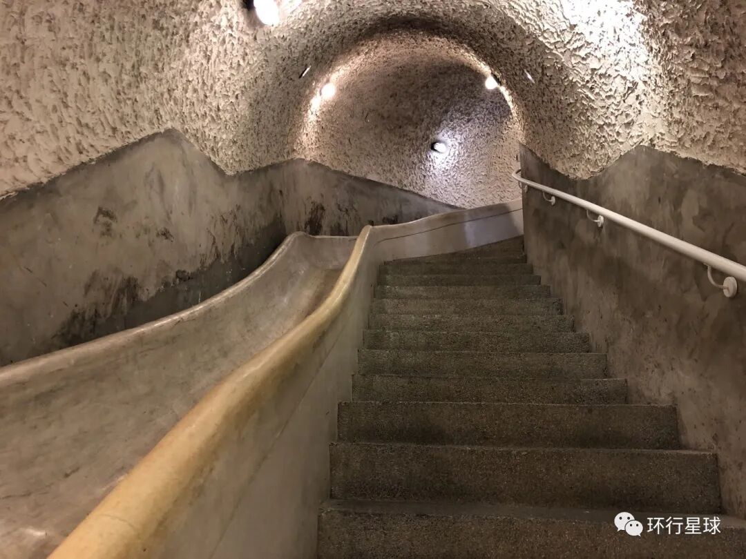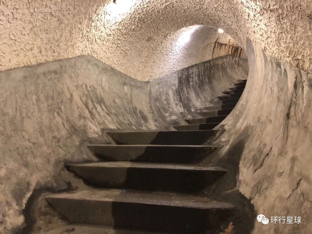 这密道一眼望不到底,四壁成弧形,尽是突刺,导游解释说这突刺是战争用的消音涂料,还有防爆防火的功能。楼梯的一半弯成滑梯,滑梯宽仅供一人勉强坐下,或者是滑行李都可以。若是要一路溜下去,还是蛮惊险的。导览时为了安全起见,滑梯部分就不开放体验了。