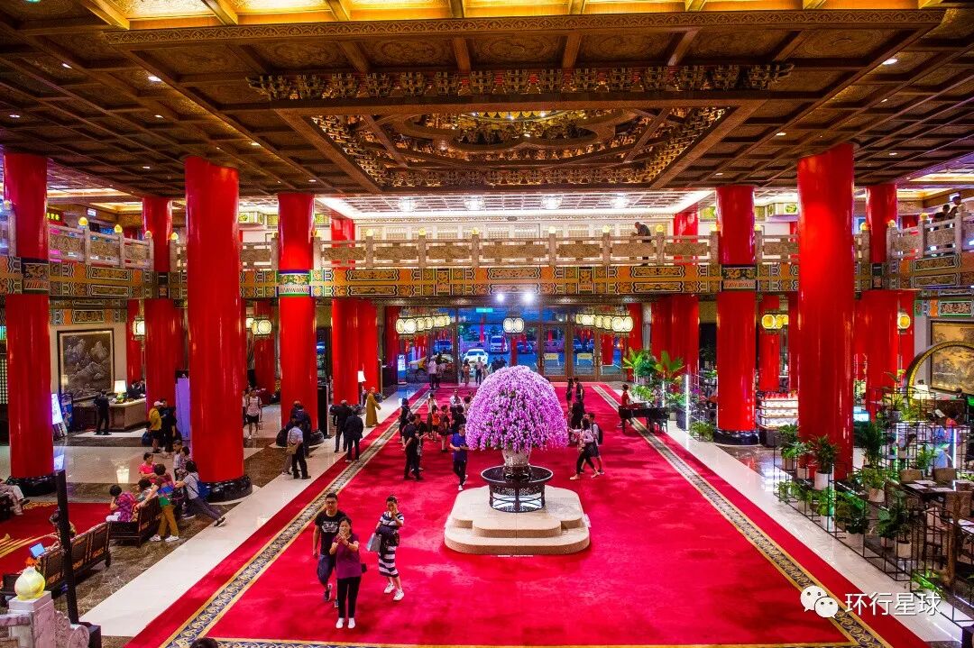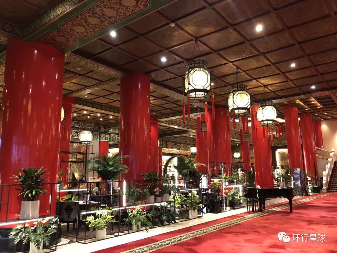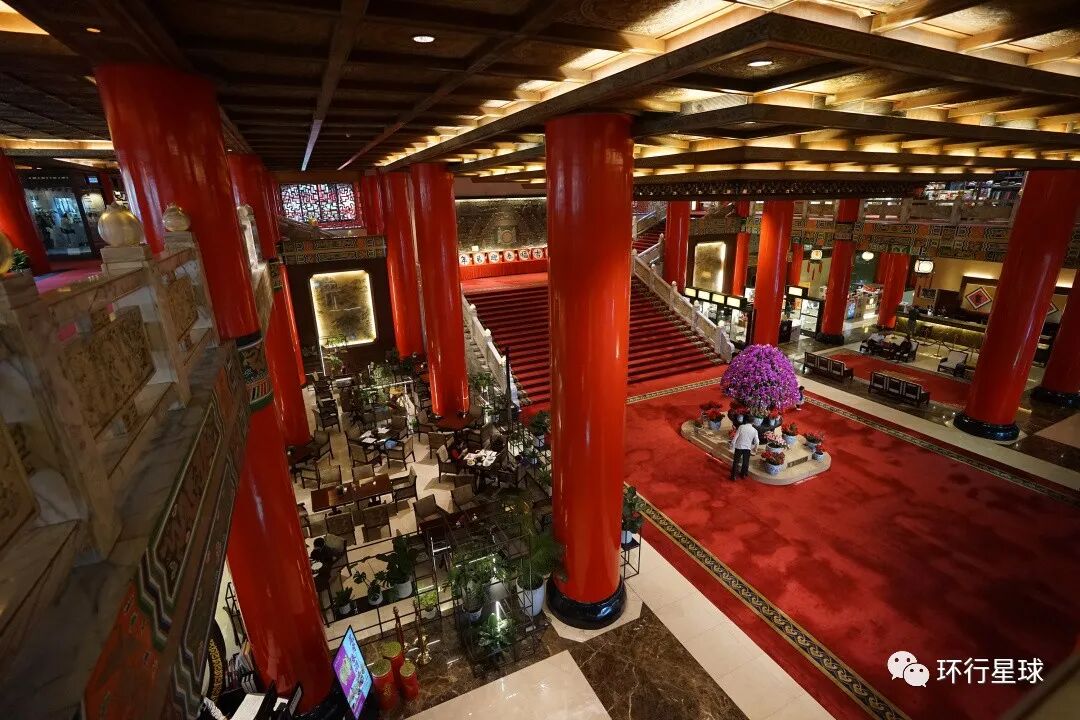 进入大厅,满眼是鲜艳的大红色,这种红色是特地为圆山饭店调制的,仅此一处才有,名字就叫“圆山红”。喜庆的颜色在中式宫灯的映衬下格外醒目。
