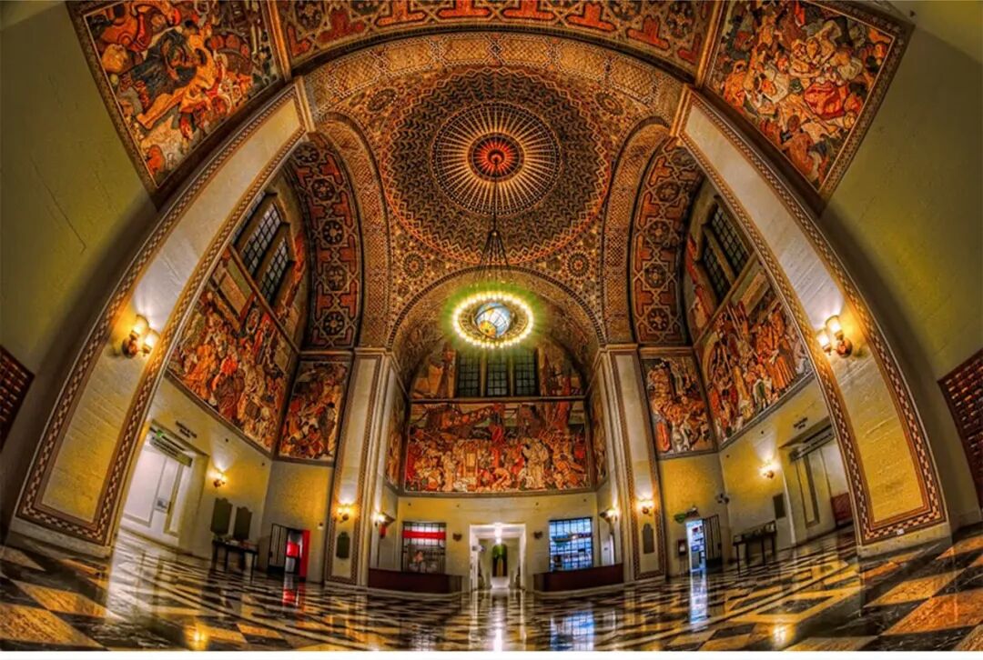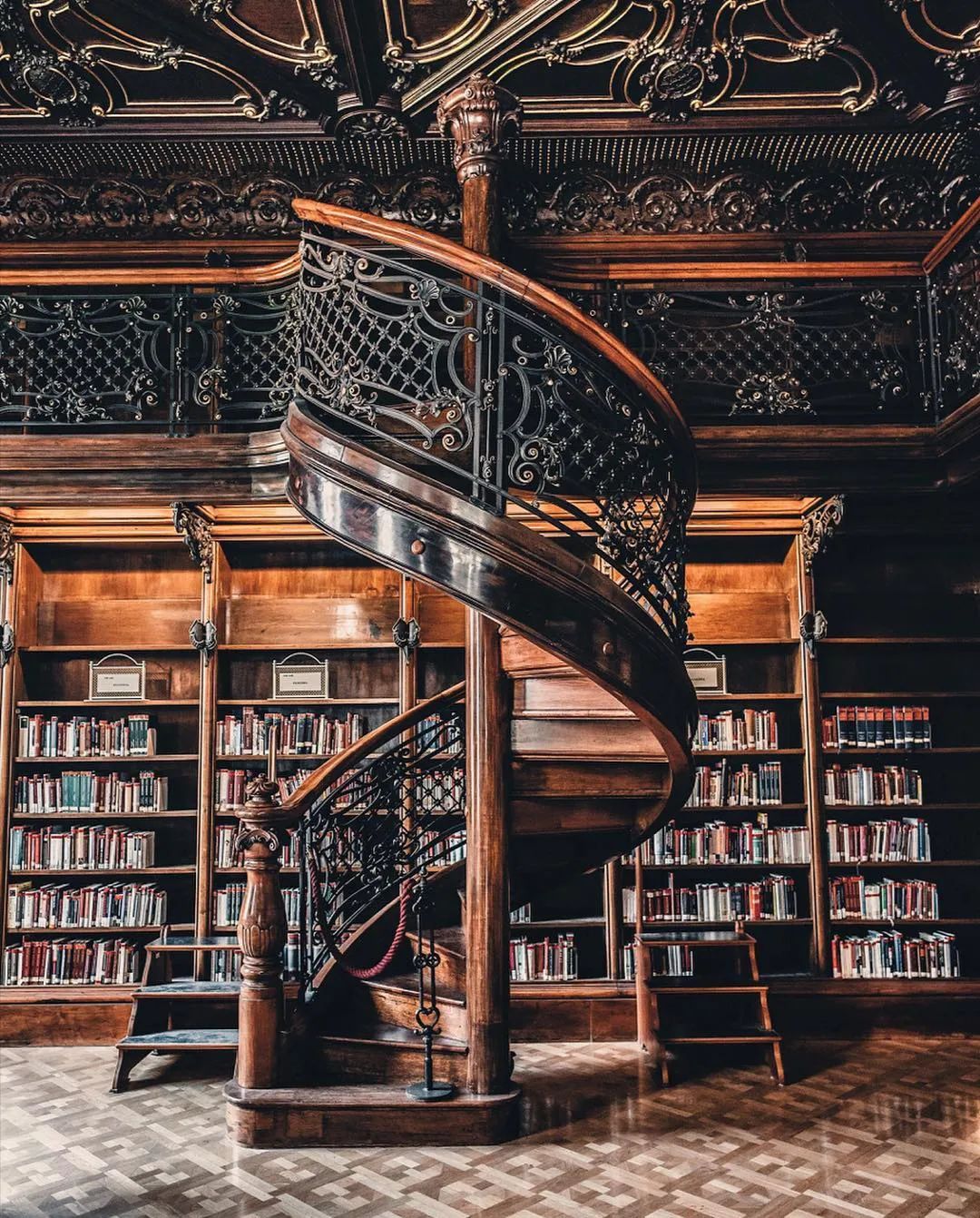 坐落在巴尔的摩约翰•霍普金斯大学,建于19世纪煤气照明和钢铁年代,图中的立柱、柱顶、露台、扶手和天花板都是铁铸的。