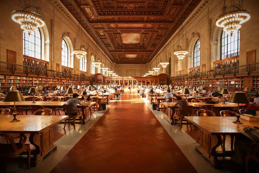 纽约公共图书馆是美国最大的公共图书馆之一,坐落在纽约繁华的第五大道上。图书馆里面的装饰有古典的艺术性。