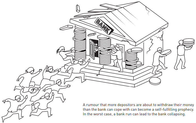 尽管如此,他们的分析也表明上述两项行动的组合导致银行面临其即将倒闭等谣言的冲击。如果大批储户同时到银行取款,这类谣言很可能成为一个自我实现的预言——银行因挤兑而倒闭。政府提供存款保险并作为银行最后资金提供方可以规避这种危险状态的发生。