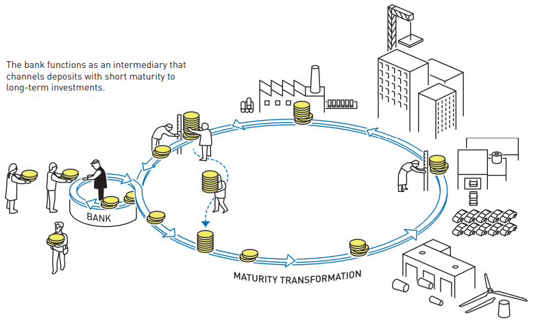 为了让经济正常运行,储蓄必须转化为投资。然而,这里存在一个不可避免的矛盾:储蓄者希望在发生意外状况时立即取出资金,而企业和房主需要知道自己不至于被迫提前还贷。在其理论中,就银行如何应对该问题戴蒙德和迪维格提出一个最佳解决方案。作为接受众多储户存款的中介机构,银行可允许储户随时取出存款,同时也向借款者提供长期贷款。