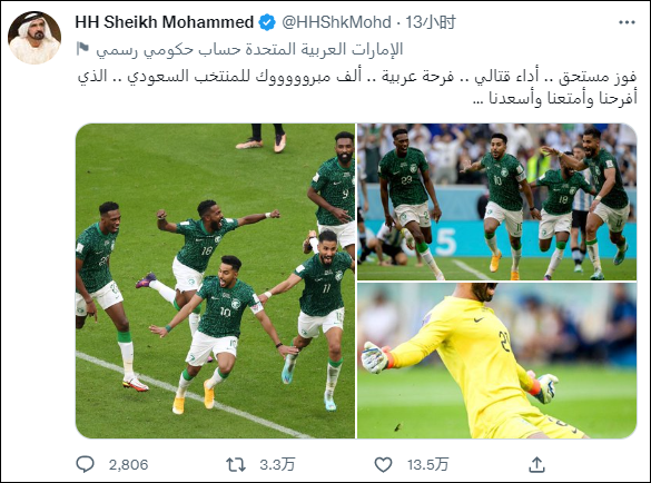 爆冷取得亚洲球队首胜后,沙特从“送分童子”一跃成为“阿拉伯之光·全村的希望”。迪拜酋长第一时间更新推特表示祝贺,称这是一场“实至名归的胜利”,“让阿拉伯人感到喜悦”。