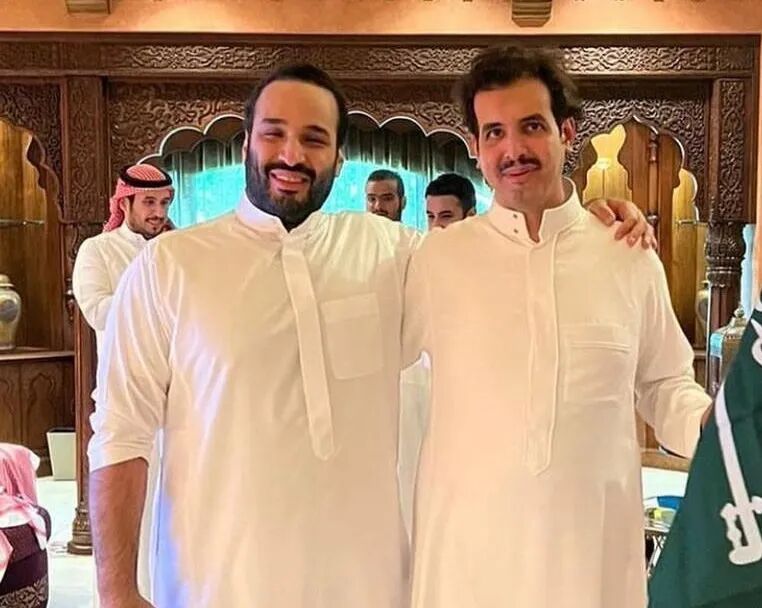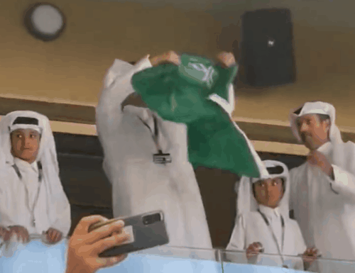 在现场观赛的卡塔尔埃米尔塔米姆,更是激动到把沙特国旗披在了肩上。