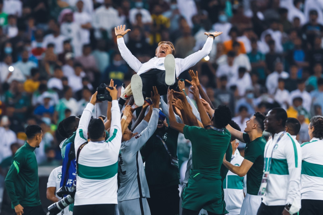 接手之后沙特战绩其实很不错,世界杯预选赛一场没输。而他也确实不负众望、再次上演大逆袭,在C组首轮比赛中,靠着精准的战术布置:越位战术和犀利反击,在上半场落后的情况下,下半场5分钟连进2球成功反杀,终结阿根廷36场不败的纪录。