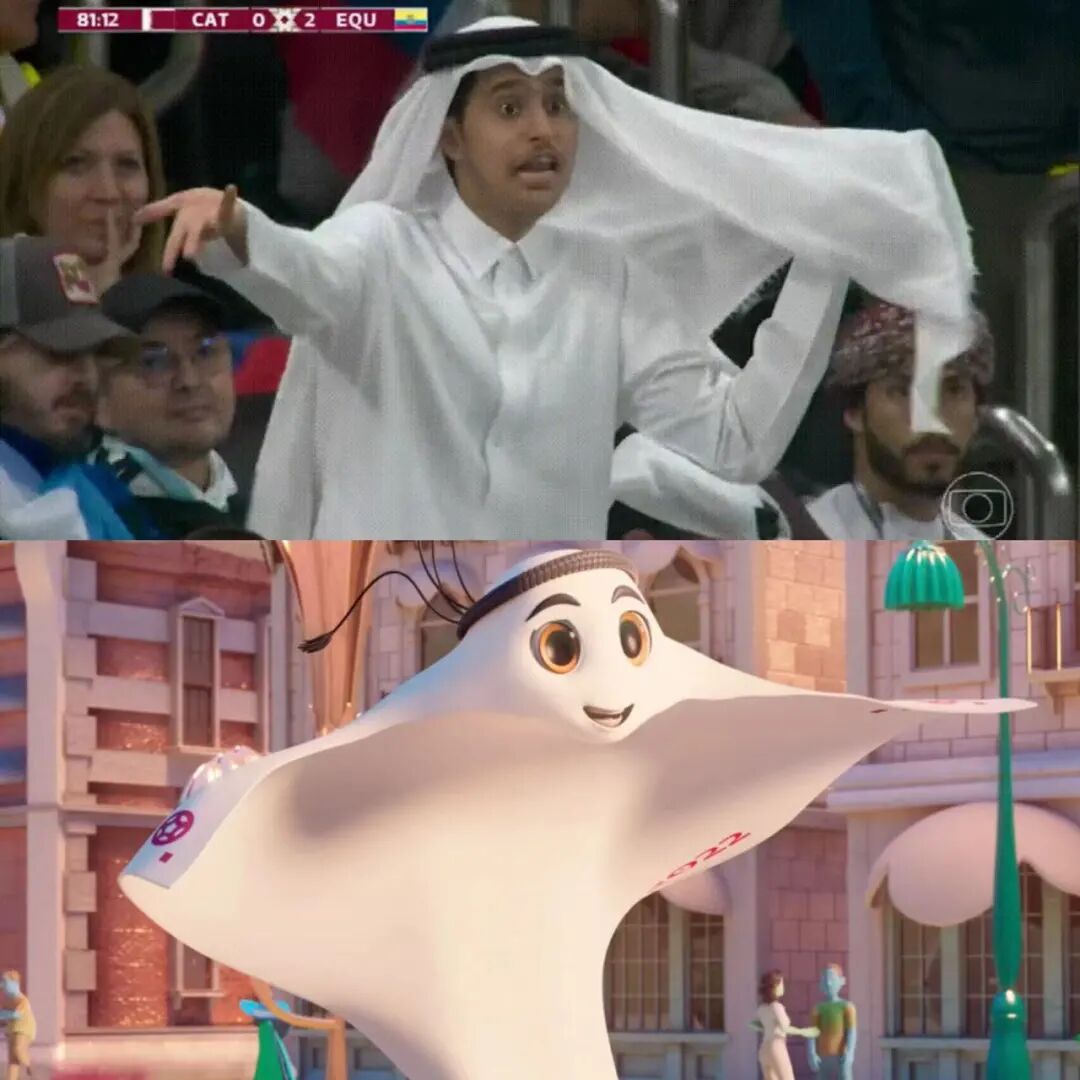 他在自家主场看到输球后直接被原地吓懵,无处安放的双手,撩“馄饨皮”头巾时焦急的样子,被P出了各种表情包。世界杯吉祥物拉伊卜极有可能是照着他设计的,人气指数直逼冰墩墩。