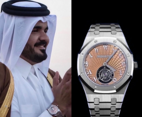 卡塔尔王室的“五阿哥”乔安·本·哈马德,最近就戴过一块爱彼皇家橡树陀飞轮超薄腕表的“中东版”,17万美元起步。