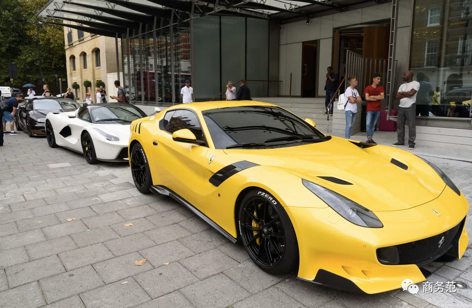 其中,前排这辆法拉利F12TDF最抢眼,黄色车身比大黄蜂还有存在感。
